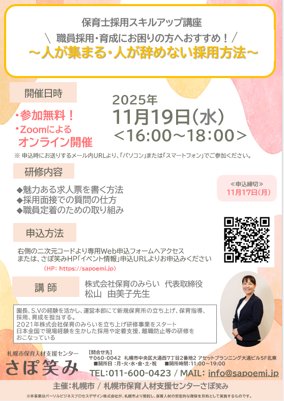11月19日(水)開催♬保育士採用スキルアップ講座のご案内 ※参加無料